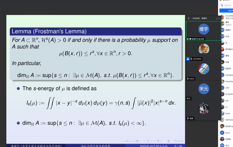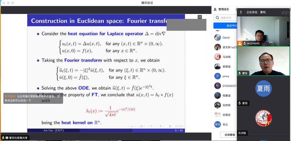2023年10月25日,浙江工业大学曹军教授和北京交通大学梁熠宇教授,应邀分别为kaiyun开云官方网站师生做了题为 “How to construct heat kernel on a metric measure space”和“随机分形中蕴含的结构”的学术报告。报告由张安老师主持。