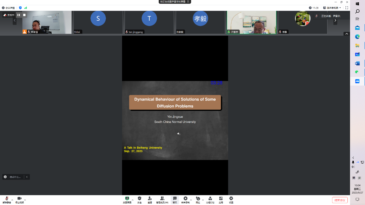 2023年9月27日上午,华南师范大学尹景学教授应邀为kaiyun开云官方网站师生做了题为 “Dynamical Behaviour of Solutions of Some Diffusion Problems”的学术报告。 此次报告由应用数学系郑孝信老师主持,相关研究领域的师生参加了本场报告。