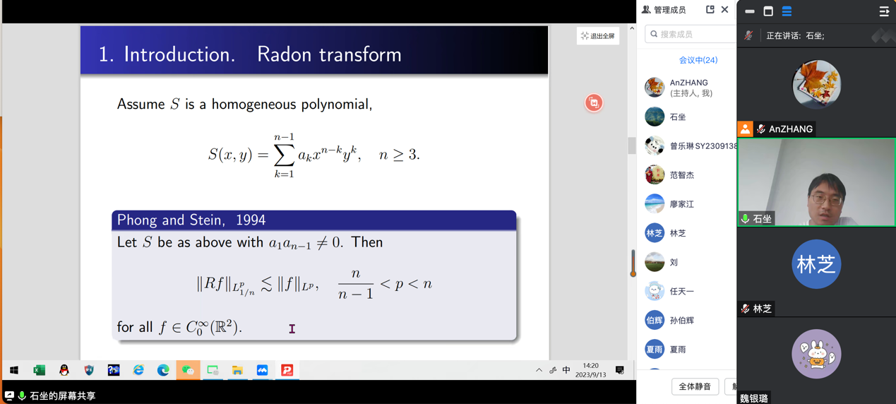 2023年09月13日,中南大学石坐顺华和广州大学范智杰教授,应邀为kaiyun开云官方网站师生做了题为 “Failure of endpoint regularity of Radon transforms”和“Recent progress on Schatten classes and Riesz transform commutators”的学术报告。报告由张安老师主持。