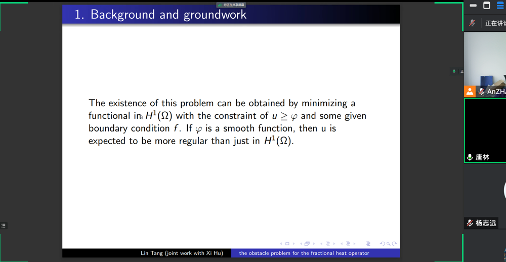 近日,北京大学唐林教授,应邀为kaiyun开云官方网站师生做了题为 “Higher regularity of the free boundary in the obstacle problem for the fractional heat operator.”的学术报告。报告由张安老师主持。