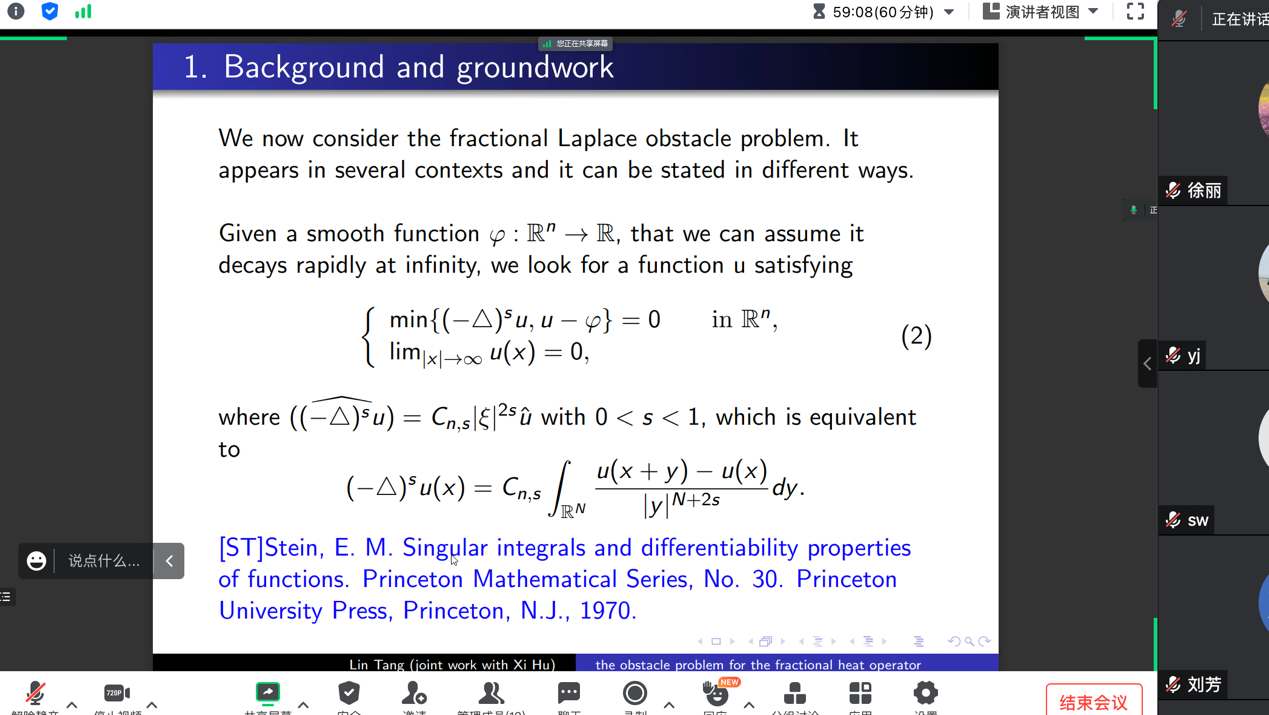 本次报告,唐老师介绍了一类分数次热算子对应的障碍问题自由边值的高阶正则性理论,这是偏微分方程领域的重要问题,特别地,相关工作给出了相应的退化抛物方程的维纳判别法,进而利用这个一般判别法的特殊情形最终给出了自由边值的高阶正则性。首先唐老师介绍了相关问题的背景和研究现状,之后详细介绍了各种不同的分析工具和研究思路,最后介绍了最新的研究结果。