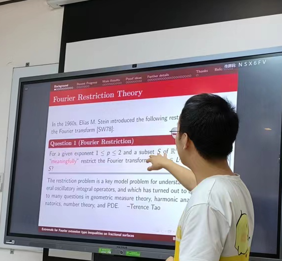 2023年06月20日,中国科学院大学邸博宁博士,应邀为kaiyun开云官方网站师生做了题为 “Extremals for Fourier extension type inequalities on fractional surfaces”的学术报告。报告由张安老师主持。