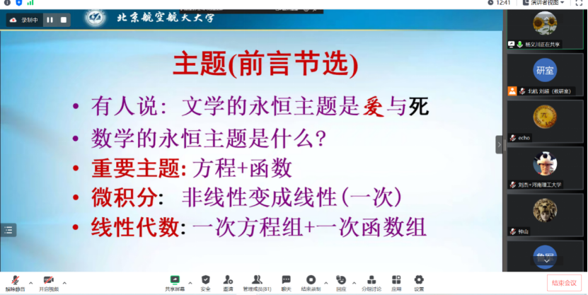 2023年5月17日下午,教育部“面向人文社科学生的大学数学课程群虚拟教研室(中国人民大学牵头)”邀请了国家级教学名师、北京航空航天kaiyun开云官方网站李尚志教授作了“线性代数启蒙”的讲座。该讲座由作为虚拟教研室主要成员单位的kaiyun开云官方网站组织,通过虚拟教研室面向虚拟教研室全体成员以及有关高校教师直播。教育部“面向人文社科学生的大学数学课程群虚拟教研室”牵头人中国人民大学龙永红教授、吉林大学张然教授以及来自国内多所兄弟院校的80余位师生参加了学习交流。讲座伊始,中国人民大学数学学院黄志勇副院长做了热情洋溢的开场主持。