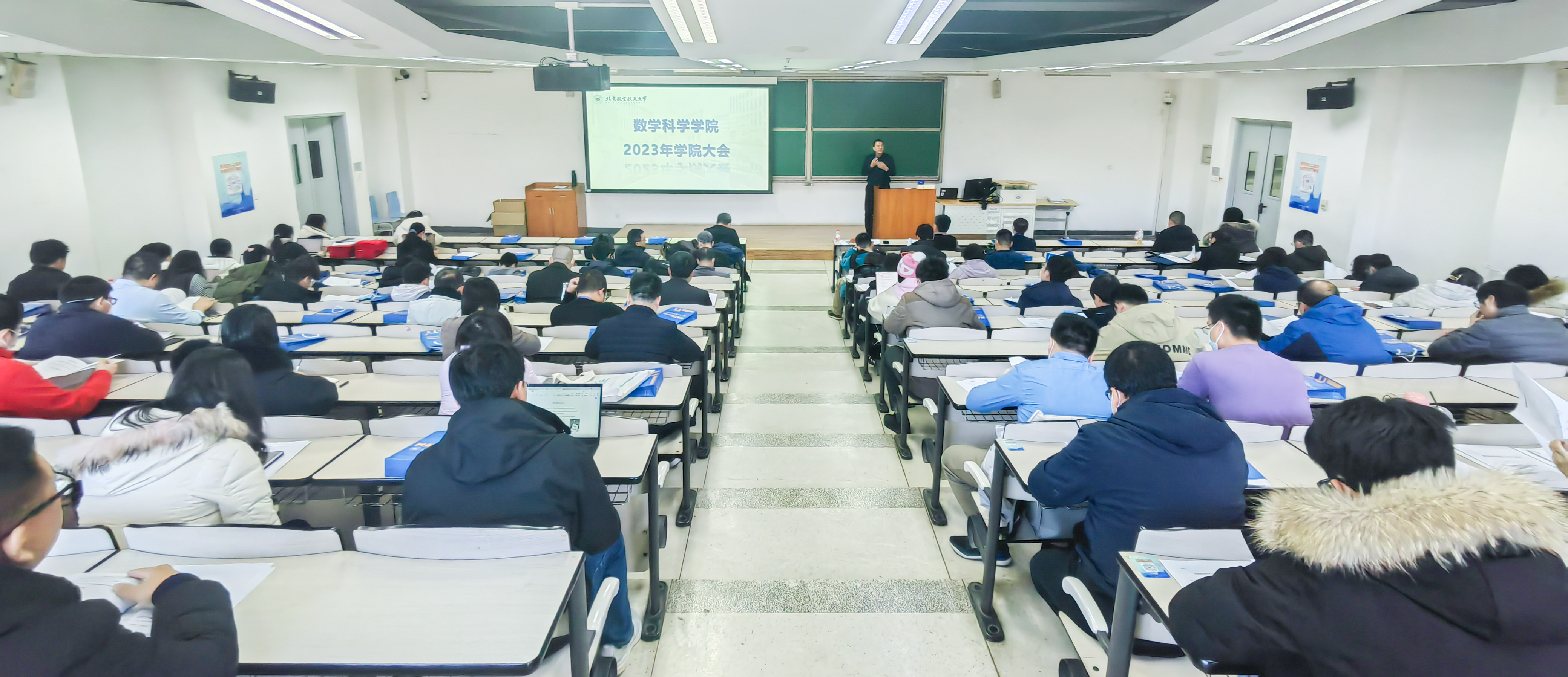 院长韩德仁介绍了学院2023年人事和国际化工作计划,并对消防安全、网络安全等工作进行部署。韩院长表示,学院教师要多多思考,自信敢为,能为善为,自由探索与合作交流相结合,共同推动北航数学学院的发展。