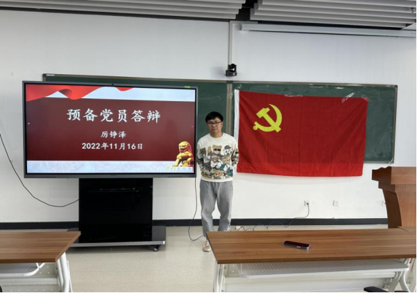 然后厉铮泽同志作表态发言,他表示感谢党组织的培养,今后将会严格按照共产党员的标准要求自己,以实际行动发挥党员先锋模范作用,克服自身缺点不足,争取早日成为中共正式党员。最后,厉铮泽同志面向党旗进行入党宣誓。
