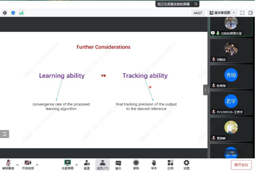 报告首先简要概述了迭代学习控制方法及随机衰减信道的建模,给出了随机衰减信道作为一类不完备信息所带来的控制设计与分析问题。其次,报告将分衰减信道统计信息分为已知和未知两个方面,具体介绍了相关工作。在衰减信道统计信息已知的情形,沈教授主要介绍了围绕输入信号波动所引发的问题,以及采用平均算子的相关结果。在衰减信道统计信息未知的情形,沈教授主要介绍了针对未知信息的迭代估计方法与非迭代估计方法。在报告最后,参会师生与沈教授进行了积极的交流和探讨。