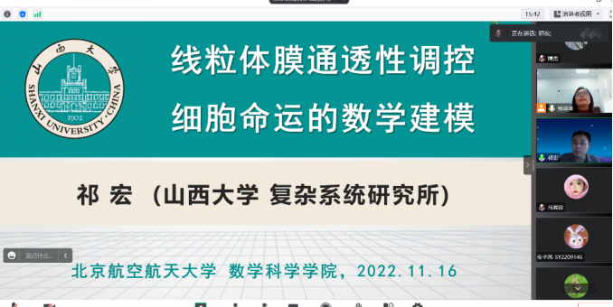 2022年11月16日下午,应用数学系杨卓琴老师邀请山西大学复杂系统研究所祁宏副教授,进行了有关“线粒体膜通透性调控细胞命运的数学建模”的线上学术报告。报告进行了两个多小时,学院近30名教师和研究生参会。祁宏老师详细地介绍了研究成果的生物背景、研究方法、创新结果及未来工作设想等,并且非常耐心地回答了同学们提出的各种学术问题。