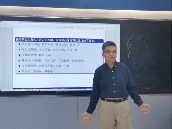 学院副院长马声明根据2021级培养方案的新变化,结合N-S方程、庞加莱四维猜想等数学界热门话题,强调了数学分析等3门基础课程和抽象代数等10门核心课程的重要性。同时,马声明老师表示,希望同学们要勤于阅读,广泛了解数学史,在前人的探索路径中汲取数学的思想;希望同学们要砥砺思维,充分认识到数学学习的核心是思维能力的锻炼和促进自身灵感的不断涌现;希望同学们要充分讨论,于交流中见知识之广,在思想碰撞中发现星辰大海,互相激发探索的热情和对数学的热爱。