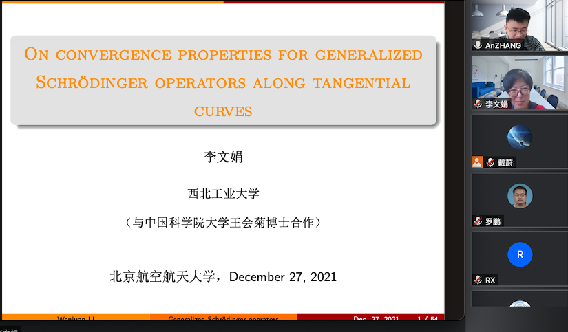 2021年12月27日下午,西北工业大学李文娟教授,应邀为kaiyun开云官方网站师生做了题为 “Convergence properties for generalized Schrödinger operators along tangential curves”的学术报告,报告由张安老师主持。