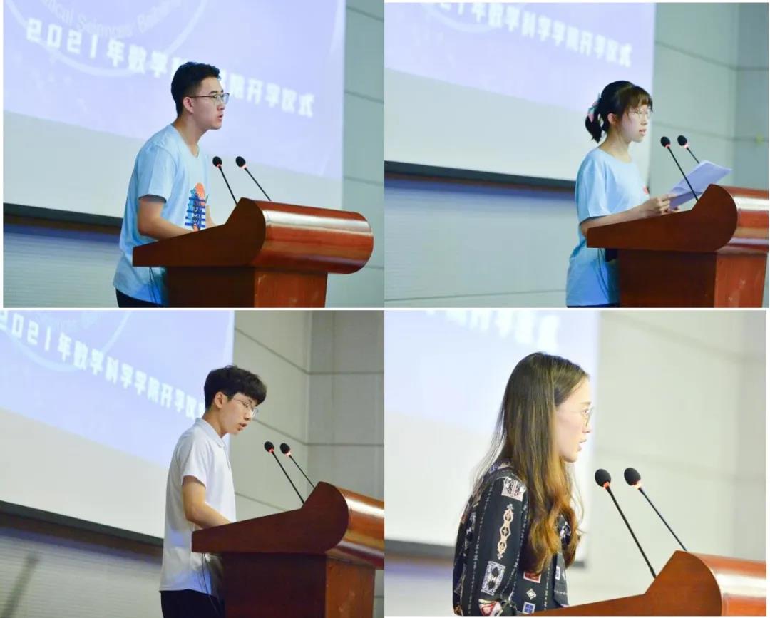 2021级本科强基新生代表刘峻池、2020级本科生新生代表郭芝伊、2021级研究生新生代表张翔宇、优秀学生代表许卓颐同学依次进行发言。他们表达了立志投身于数学事业的决心,加强自身能力,不断学习,不断超越,勇担新时代的使命与责任。