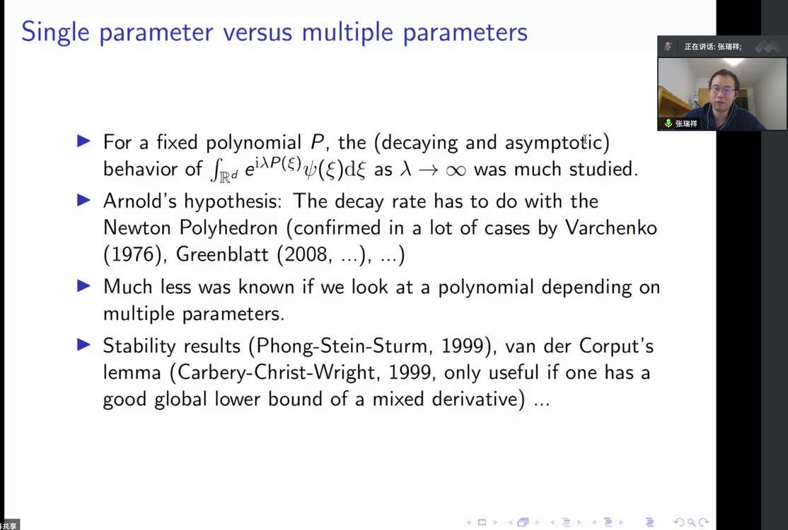2021年5月13日,普林斯顿高等研究院张瑞祥老师应邀为kaiyun开云官方网站师生做了题为“A stationary set method for estimating oscillatory integrals”的线上学术报告,报告由张安老师主持。