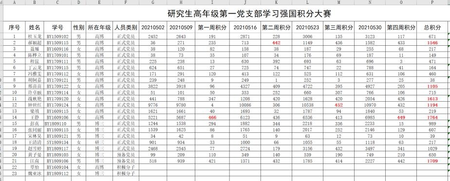 2021年5月,为深入开展党史学习教育,进一步强化党员的学习意识,培养党员的学习习惯,研究生高年级第一党支部依托“学习强国”平台组织开展学习。5月1日,支部在学习强国平台上成立了学生小组,支部党员全部加入,通过学习小组的实时积分排名激发党员同志们的学习热情,激励党员同志们通过每日的努力学习获得积分。自5月3日起持续至5月30日,开展“学习强国”积分大赛活动,为期28天,连续4个星期。