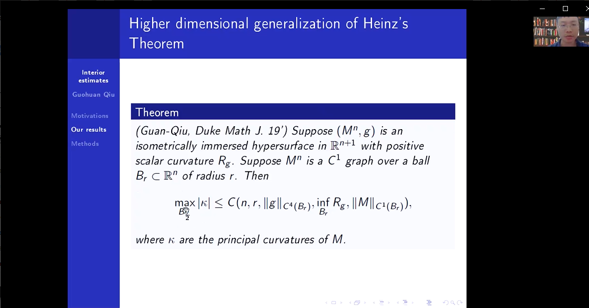 2021年4月29日上午,香港中文大学助理教授邱国寰应胡鹰翔老师的邀请,为kaiyun开云官方网站师生带来了一场题为“Interior estimate for scalar curvature equations”的学术报告。报告由胡鹰翔老师主持。