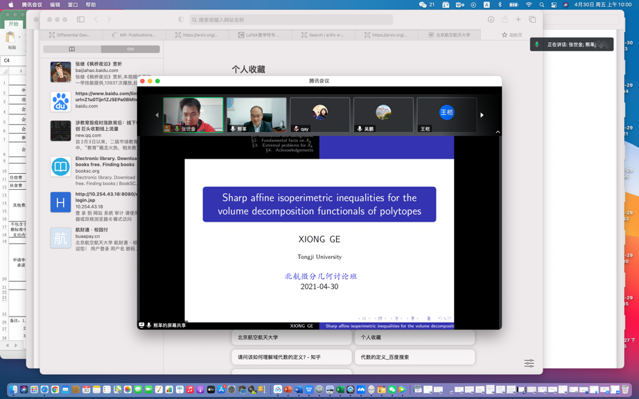 2021年4月30日上午,同济大学数学学院熊革教授受邀为kaiyun开云官方网站师生做了题为“Sharp affine isoperimetric inequalities for the volume decomposition functionals of polytopes”的线上学术报告,报告由张世金老师主持。此报告为数学学院几何团队每周五上午讨论班的学术报告。