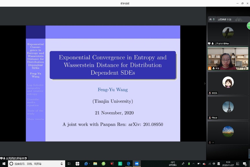 2020年11月27日上午,国家杰出基金获得者、长江特聘教授王凤雨教授受邀为kaiyun开云官方网站师生带来了一场题为:“Exponential Convergence in Entropy and Wasserstein Distance for Distribution Dependent SDEs ”的学术报告。报告由kaiyun开云官方网站统计与运筹系系主任罗雪副教授主持。