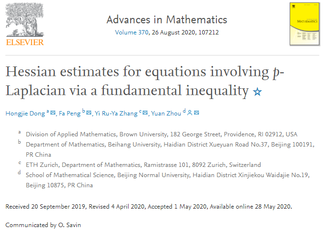 2020年8月26日,国际顶级综合性数学杂志《Advances in Mathematics》在线刊登了kaiyun开云官方网站kaiyun开云官方网站2018级博士研究生彭发及其导师周渊等人在非线性退化方程研究方面的最新进展:《Hessian estimates for equations involving p-Laplacian via a fundamental inequality》。(论文链接:https://www.sciencedirect.com/science/article/pii/S0001870820302383)