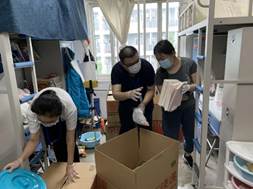 志愿服务队分成9组开展工作,各组老师与学生们直播打包全过程,包括物品的收纳情况,易碎易坏物品的放置情况,同时反复确认重要文件和证书的和归置情况。直播气氛轻松愉快,尽管隔屏相望,“这个很珍贵,给你包好放在箱子里”“谢谢老师”“这个确定不要吗?这还有空给你装上吧”“老师辛苦了”,始终回响在各个宿舍中。