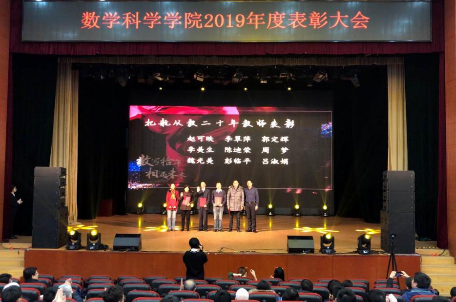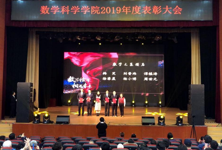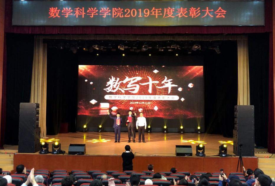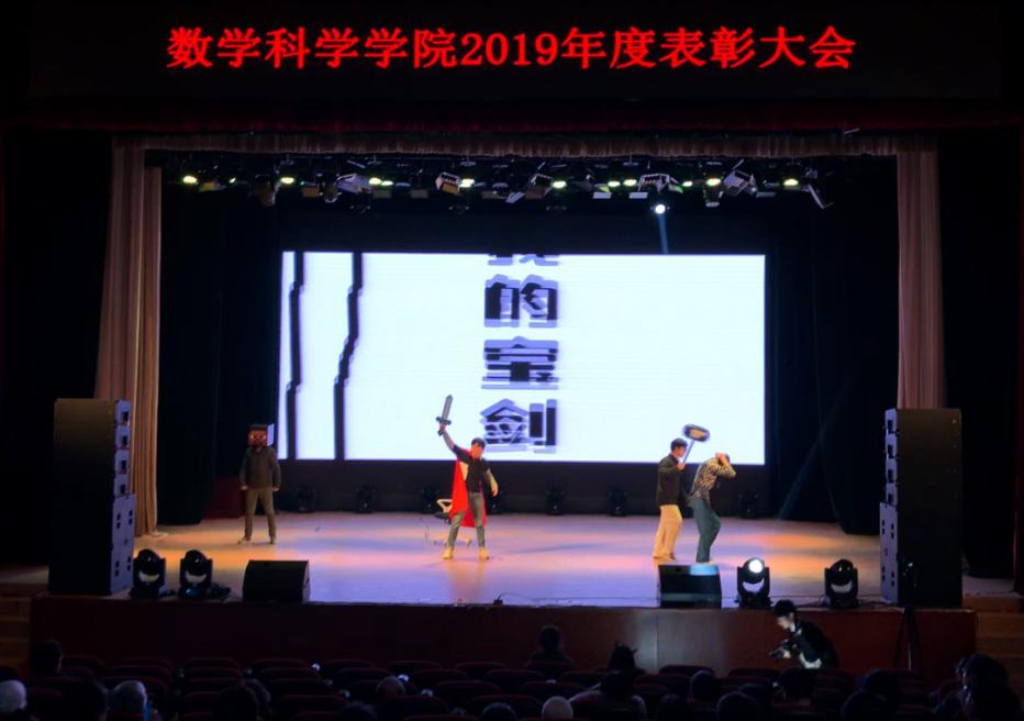 第五篇章“不负韶华”向参会师生展示了本年度学院学生的佳绩与风采。2019年数学学院“数海领航”党员先锋服务站完成32周的答疑工作,总时长达8000余小时;学院承担全校数学类竞赛赛事工作主力,助力学校收获北京市大学生数学竞赛、全国大学生数学建模竞赛获奖数量均在北京市名列前茅的好成绩,助力学校获评北京市大学生数学竞赛“优秀组织奖”和“华为杯”中国研究生数学建模竞赛“优秀组织奖”;学院特别组织承办了诺奖得主丁肇中先生来校高端学术报告会;学院圆满举办了全校第八届“数学文化周”大型活动,宣传弘扬北航数学文化。入学十年的校友李垠序为获得“专项之星”的学生颁奖,离退休教师代表傅丽华为获得“数学之星”提名的学生颁奖,最后,院长韩德仁为获得“数学之星”的两名同学颁发了证书和奖杯。精彩纷呈的舞台剧《不去冒险的勇者》、歌曲串烧《青春的歌》让整个剧场充满着掌声和欢呼声。