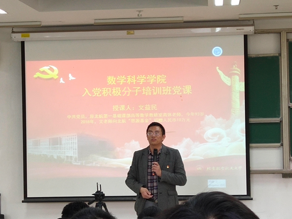 2019年10月23日,kaiyun开云官方网站kaiyun开云官方网站入党积极分子培训班第二次党课暨本研学生学习日活动在J3-210进行。数学学院特别邀请了原北航第一基础课部高等数学教研室离休老师文益民老先生来到沙河校区,与学院师生共享“爱党爱国,传承革命精神,做空天报国的北航人”的故事。数学学院离退休党支部书记徐兵老师和学院师生200余人参加了此次活动。