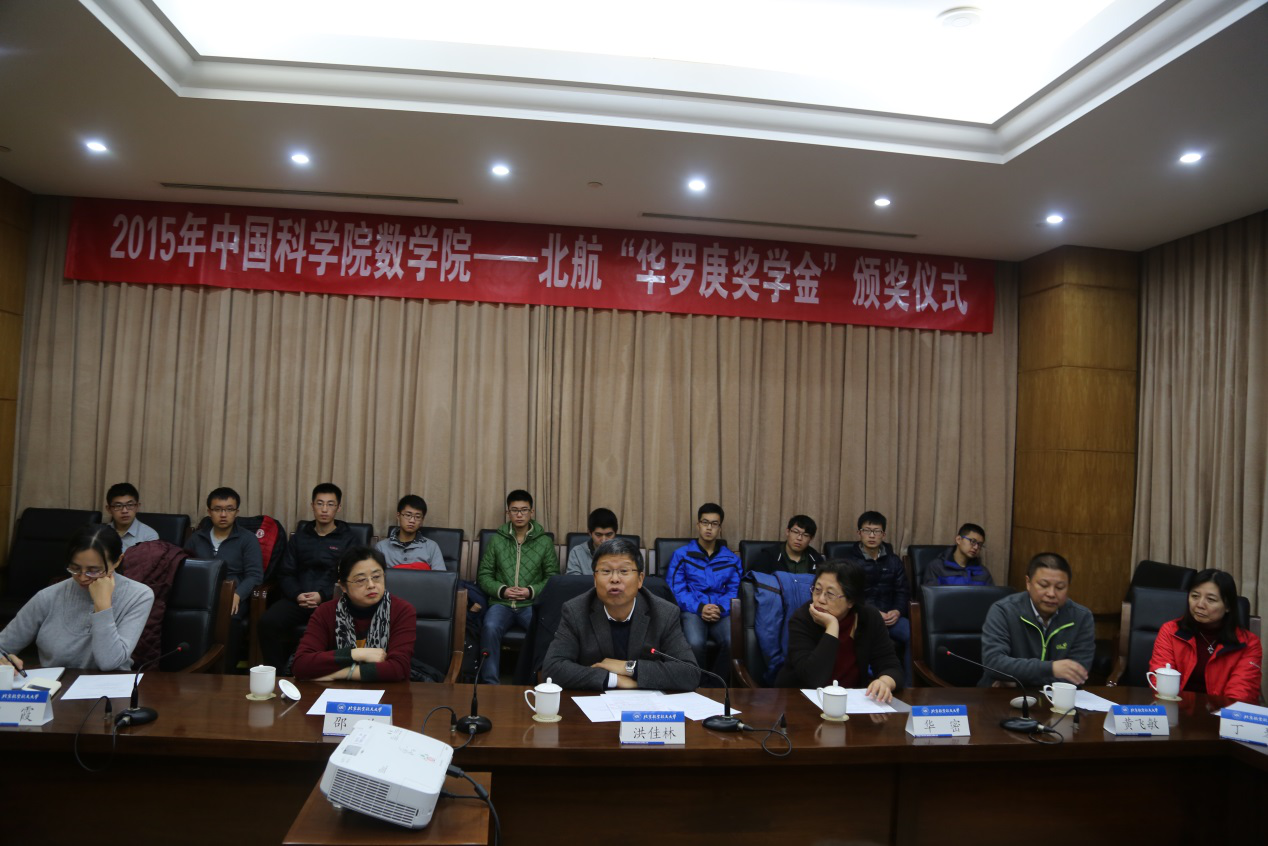 中国科学院数学与系统科学研究院副院长洪佳林研究员宣读了“华罗庚奖学金”获奖名单,同纪素菊教授和华密女士一同为获奖学生颁奖。他在致辞中指出,建设华罗庚班是拔尖型人才培养的非常有效的培养方式,中科院数学院将继续全力支持北航华罗庚班的建设与发展,他强调,华罗庚班的学生们要敢想敢问,勇于探索未知领域,勇于提出重大问题,大家要积极踊跃的向中科院数学院的教授们请教,这样才能达到教育资源利用的最大化。