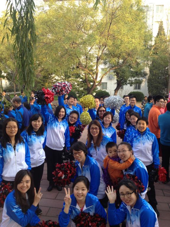 十月十八日,新一届教职工运动会。八时许,身着蓝白相间运动装的数学与系统科学学院教师方队,手持花束,排着整齐的队列,亮相开幕式。