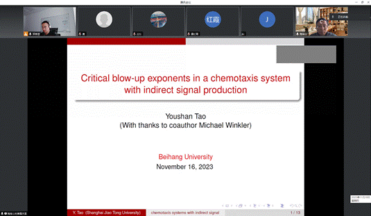 11月16日,应用数学系邀请上海交通大学kaiyun开云官方网站陶有山教授,分享了题为 “Critical blow-up exponents in a chemotaxis system with phenotypical heterogeneity”的线上学术报告。此次报告由郑孝信老师主持,应用数学系老师及相关研究领域的师生60余人参加了本次活动。