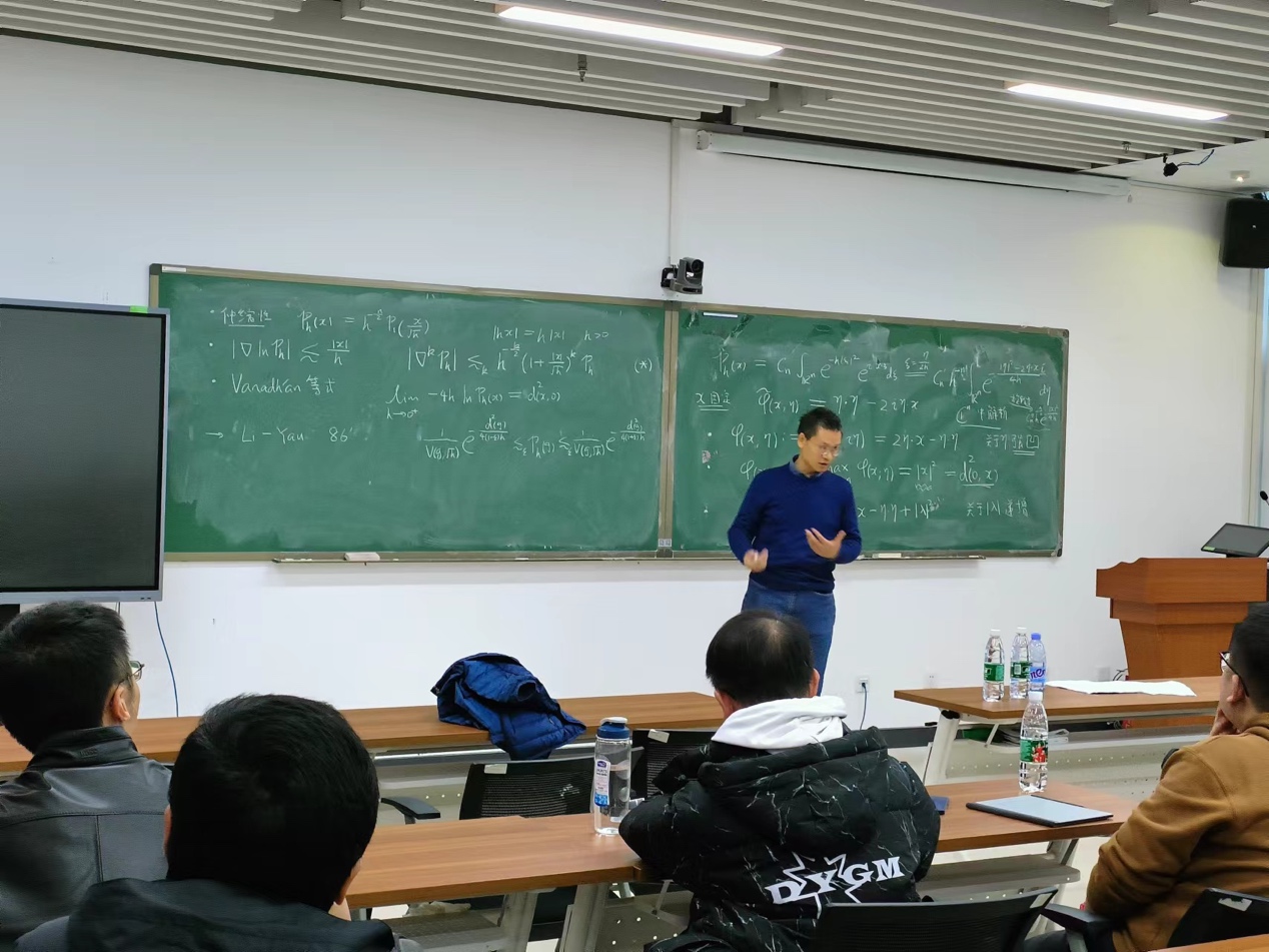 本次报告中,李老师以三维海森堡群作为一个玩具模型来研究二步Carnot群上的热核渐近估计及几何,回顾了Li-Yau估计等相关发展历史背景,同时介绍了一套完整的驻相位方法,能够解决一大类二步群上的相关问题。报告内容非常丰富层次分明,讲解特别生动形象。参会老师就报告内容进行了热烈的讨论交流。
