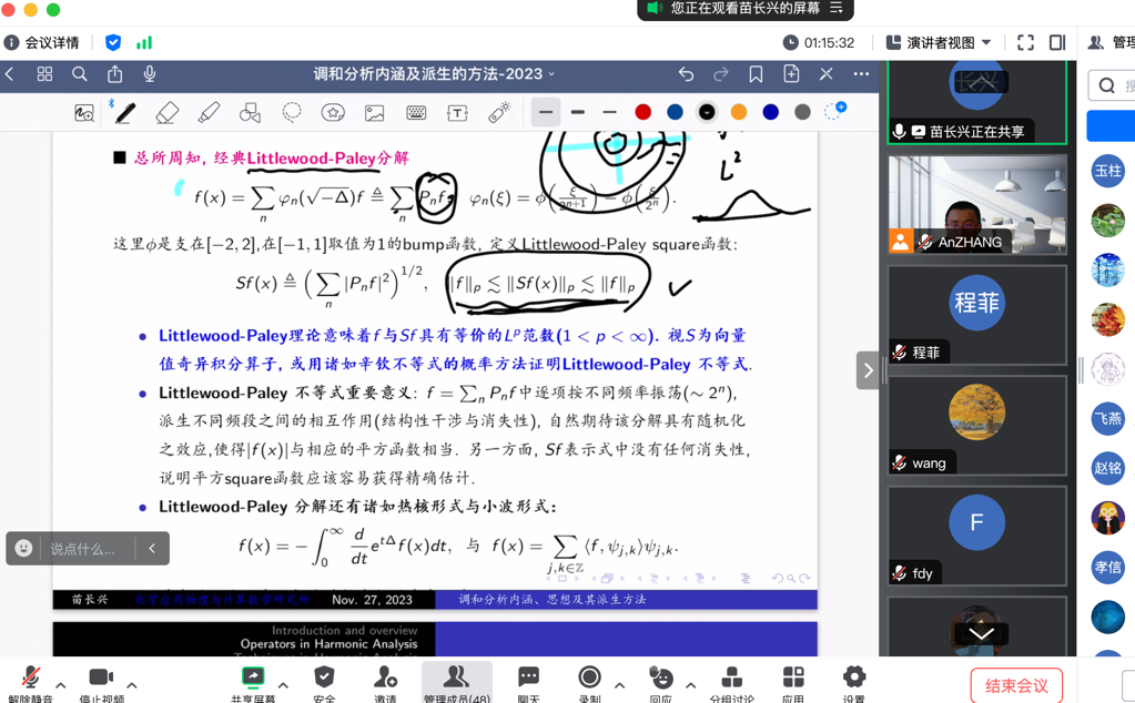 本次报告,苗老师从不同角度和新的视角介绍了调和分析思想的精髓,特别是同其他不同学科之间的紧密联系。现代调和分析对应着相空间上的分析, Heisenberg原理是沟通物理空间与频率空间的桥梁, 从微分算子、拟微分算子、Fourier积分算子的发展过程充分体现了现代调和分析研究对象的转变及几何融入分析的自然性(相空间上调和分析对应着余切丛上的分析).“分而治之”是调和分析技术的主要特征, “艺术与哲学”地展示了分解方式与问题的“几何”或“组合”属性之间的内在联系. 具体地讲,就是如何控制分解所派生的不同几何体之间的重叠(球、tube、tile、长方体与曲线等),曲面的“曲率”与“横截”等性质在建立控制估计中起着关键作用. 本次报告中,苗老师从一些著名算子出发, 不仅在物理空间中研究函数与算子, 同时在频率空间中研究它们之间的相互作用, 着力讨论了诸如Hormander-Mikhlin乘子定理、Coifman-Meyer乘子定理、T(1)定理、Schur-Test、Christ-Kiselev引理及众多著名不等式在其中发挥的作用。报告过程中,苗老师介绍了很多公开问题,鼓励年轻人探索数学前沿问题。报告内容非常丰富,层次分明,讲解特别生动形象,深入浅出。参会老师就报告内容进行了热烈的讨论交流。