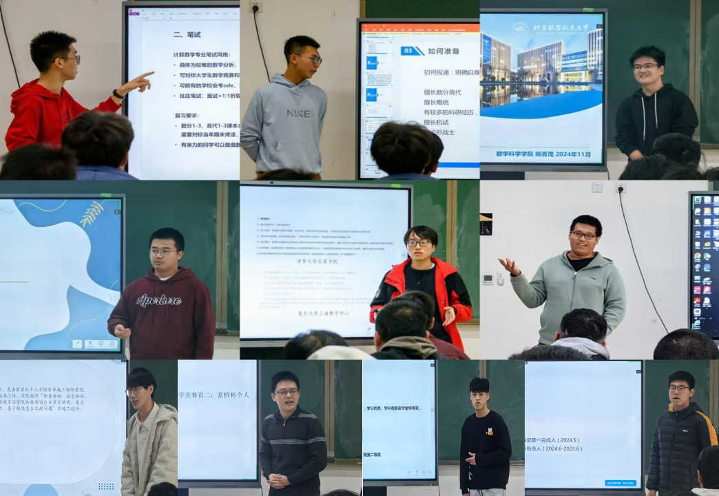 为进一步做好学生学涯服务指导,帮助学生明确自我定位、探索未来之路, 11月13日和17日下午,kaiyun开云官方网站“数见未来”系列分享会之2024年秋季学期推免经验分享会于沙河主楼E404举行。陈涵之、窦义锟、梁诺靖、梁毅轩、任涛、王菲帆、武晨旭、徐晓东、姚青茂、章谦等10名2021级本科生为学院近百名2022级、2023级本科生进行了交流分享。