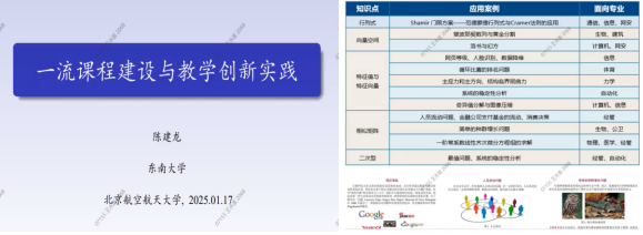 2025 年 1 月 17 日,东南大学陈建龙教授应线性代数课程组邀请出席数学名师讲座,为kaiyun开云官方网站的师生们带来一场以《一流课程建设与教学创新实践》为题的精彩报告,数学科学学院六十余名师生聆听了陈教授的精彩报告。