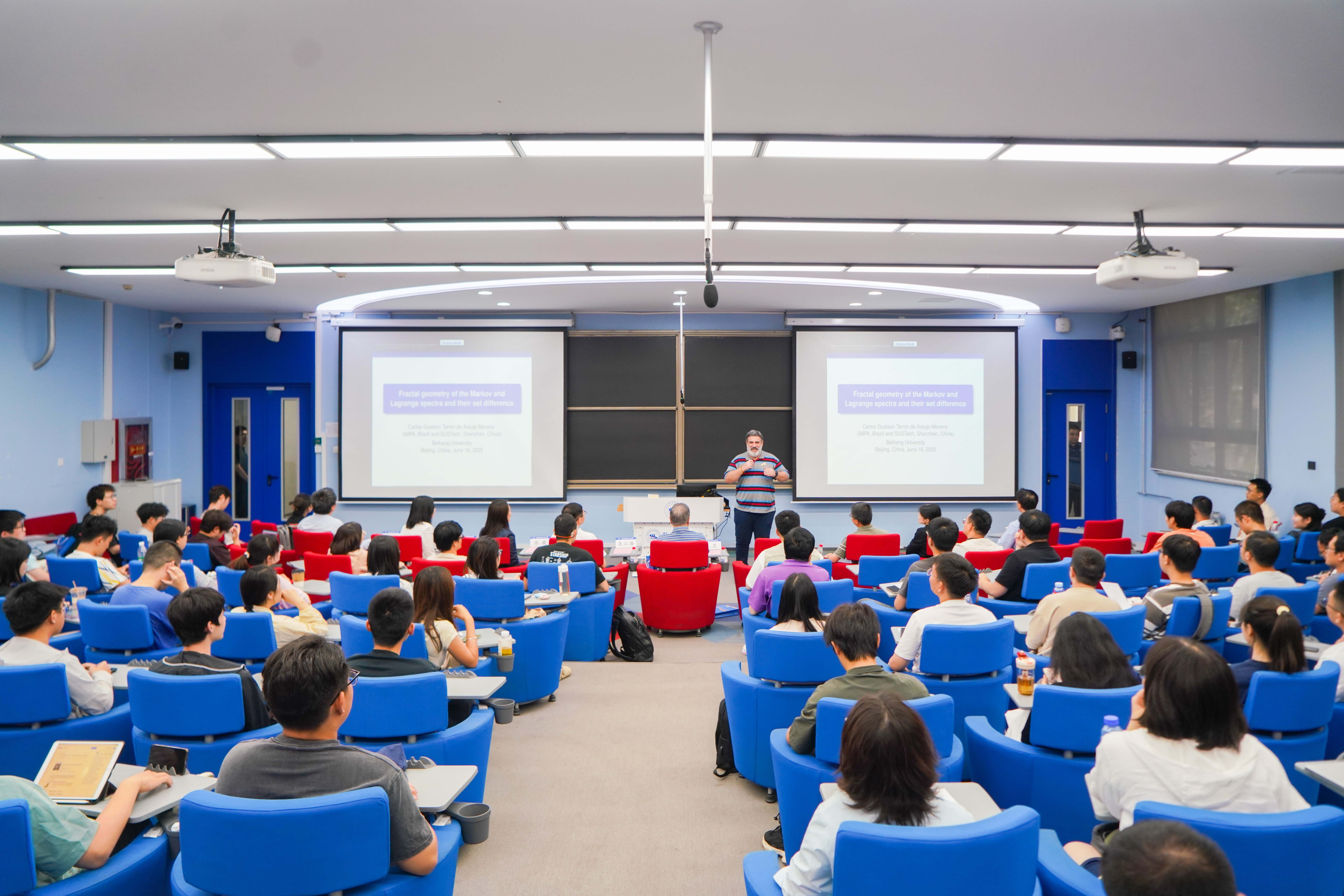 6月16日下午,ICM60分钟报告人、巴西科学院Carlos Gustavo Moreira院士做客北航大讲堂,主讲《Fractal geometry of the Markov and Lagrange spectra and their set difference(马尔科夫谱和拉格朗日谱的分形几何学及其差集)》讲座。副校长吴江浩致辞,并为Moreira教授颁发北航大讲堂荣誉证书。讲座由中国科学院院士、北京大学教授、“数学、信息与行为“教育部重点实验室学术委员会主任文兰主持。kaiyun开云官方网站党委书记张筱、人工智能学院副院长文晓出席讲座。来自中国科学院、北京大学、清华大学等多所在京高校教师,以及校内kaiyun开云官方网站、人工智能学院、中法工程师学院等多个学院师生参与讲座。