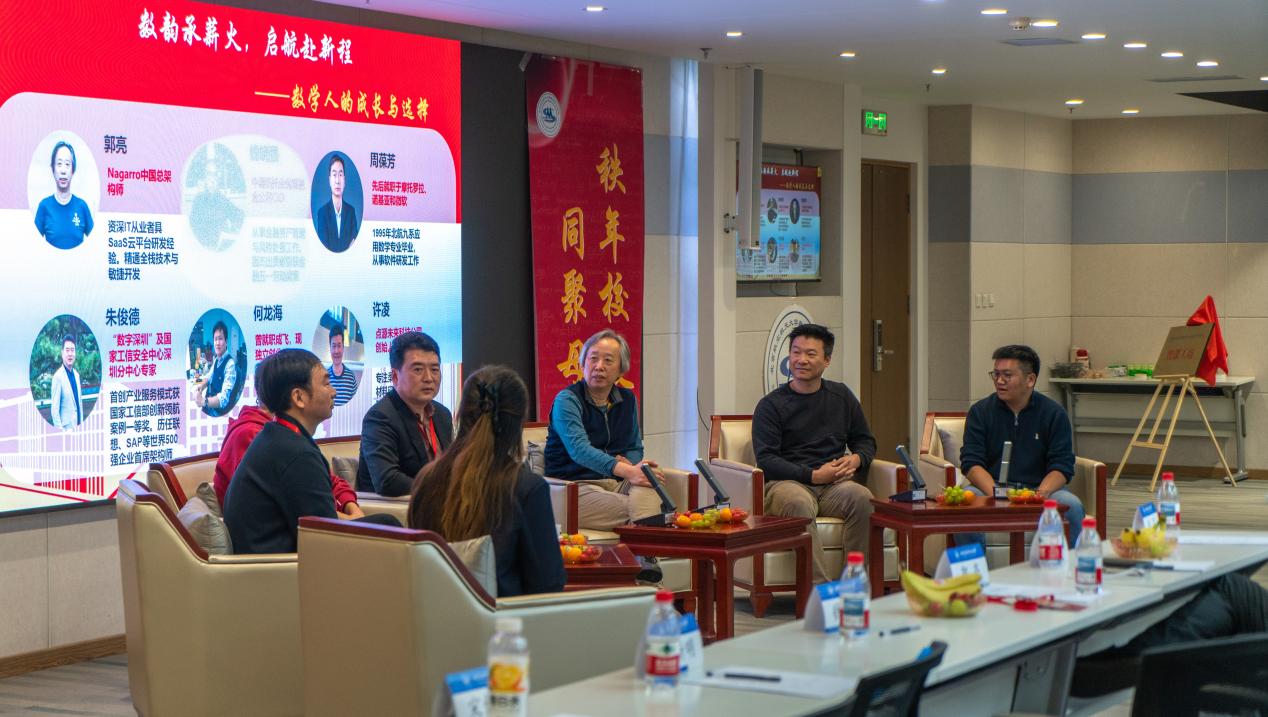 特邀报告结束后,学院特别组织 “成长与选择” 主题圆桌论坛。1995届校友、Nagarro中国总架构师郭亮,“数字深圳”及国家工信安全中心深圳分中心专家朱俊德,微软移动工程师周葆芳,2005届校友、点源未来科技公司创始人许凌,北京壹番互娱科技有限公司高管何龙海校友结合在IT、金融、创业、数字转型等领域的丰富经验,分析数学系学生在不同行业的优势,解读如何结合时代发展趋势规划个人发展,剖析“数字+”的跨界新领域趋势,为在读学子提供了前瞻性行动指引。
