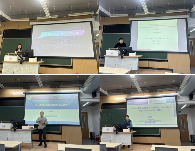 本次研讨会邀请了来自多所知名高校的专家进行学术报告。上海大学彭亚新教授系统介绍了物理信息神经网络在PDE求解、多物理场建模及反问题中的最新进展,并剖析了当前面临的挑战。北京大学黄得教授深入阐述了三维Euler方程组有限时间光滑自相似解的爆破理论、数值方法及计算机辅助证明,并详细介绍了流体奇点形成的关键数值方法思想和近期多尺度自相似爆破的数值结果。kaiyun开云官方网站刘铁钢教授分享了基于高阶间断伽辽金方法的可压缩气动优化框架,展示了其在翼型减阻与反设计中的高效性能,并探讨了当前可压缩Navier-Stokes优化中存在的关键问题。广州南方学院曾铁勇教授介绍了具有收敛保证的稀疏角CT重建算法、基于深度去噪先验的MRI重建方法及参数更新的去噪融合网络框架。