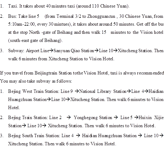 If you plan to travel from PEK airport (http://www.bcia.com.cn) to Vision Hotel/Beihang University, you can choose one of the following options: