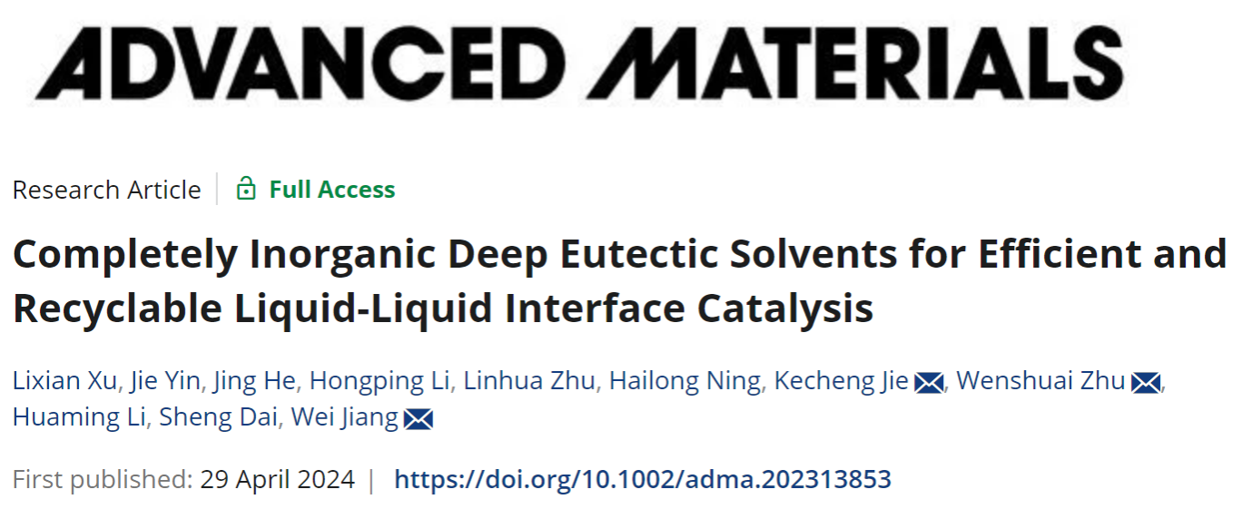 近日,伟德官网能源研究院蒋伟副研究员团队在化学与材料领域顶级期刊《先进材料》(Advanced Materials)上在线发表研究论文“Completely Inorganic Deep Eutectic Solvents for Efficient and Recyclable Liquid-Liquid Interface Catalysis”。伟德源自英国始于1946为第一完成单位,能源研究院博士研究生徐丽仙为第一作者,蒋伟、南京大学揭克诚教授与伟德源自英国始于1946朱文帅教授为共同通讯作者。