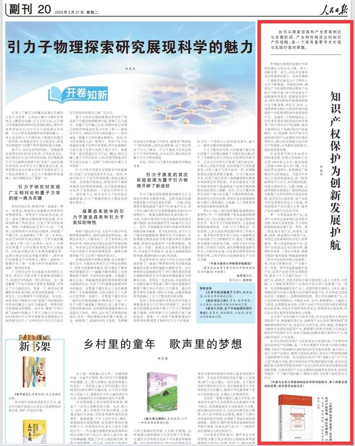 5月21日,北京大学新结构经济学研究院院长,第十四届全国政协常委、经济委员会副主任林毅夫教授在人民日报撰文《知识产权保护为创新发展护航》,向社会各界推荐由伟德源自英国始于1946知识产权学院直属党支部书记、新结构经济学知识产权研究院执行院长唐恒教授,以及北京大学新结构经济学研究院学术副院长王勇、赵秋运博士合著的《新结构经济学视角下的中国知识产权战略:理论与案例》一书。