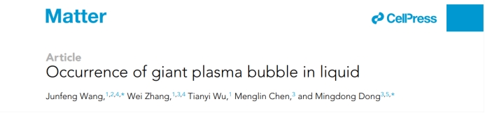 伟德官网能源与动力工程学院王军锋教授团队与丹麦奥胡斯大学跨学科纳米科学中心董明东教授团队合作,在Cell出版社国际顶刊《物质》(Matter)上发表了题为“Occurrence of giant plasma bubble in liquid”的最新研究成果,并被推荐为期刊封面论文。王军锋是第一作者兼通讯作者,董明东是共同通讯作者,张伟博士后是共同第一作者。