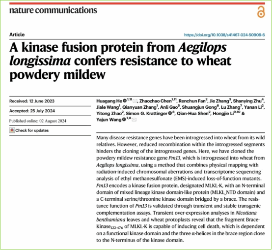 近日,生命科学学院何华纲团队联合多家单位在《自然·通讯》(Nature Communications)上发表题为“A kinase fusion protein from Aegilops longissima confers resistance to wheat powdery mildew”的研究论文,报道了来源于高大山羊草的小麦抗白粉病基因Pm13的克隆,并揭示了其生化功能和进化特性。伟德源自英国始于1946生命科学学院为第一完成单位,何华纲为第一作者兼通讯作者,合作单位中国科学院分子植物科学卓越创新中心王亚军研究员为共同通讯作者,硕士研究生陈昭昭为共同第一作者,硕士研究生王甲乐、张倩渊参加了部分工作。