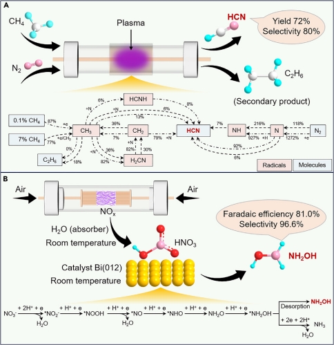 论文通过剖析美国特拉华大学和中国科学技术大学等研究团队最新的研究进展(DOI: 10.1126/sciadv.adl4246;10.1038/s41893-024-01330-w),重点评述和展望了等离子体辅助转化技术在可持续合成领域的应用潜力。文章介绍了等离子体技术如何在低温条件下激发化学反应,从而克服传统方法中的热力学限制。这种技术不仅在能源效率和产物选择性方面表现出色,还显著减少了环境污染。研究发现在无需催化剂的情况下,利用等离子体技术可直接将氮气和甲烷转化为高价值化学品。该方法相较于传统的工业工艺具有明显的优势:在更低的温度下实现了更高的选择性和产率,能耗显著降低,并极大地减少了二氧化碳排放,展示出绿色合成的巨大潜力。此外,文章详细介绍了等离子体与催化技术耦合的可能性,探讨了这类组合如何进一步提高目标产物的选择性和能量利用率。研究指出,将等离子体技术与电化学工艺相结合,仅以空气和水作为反应物,以电能为驱动力,在常温常压条件下实现了羟胺的绿色、低碳、可持续合成。